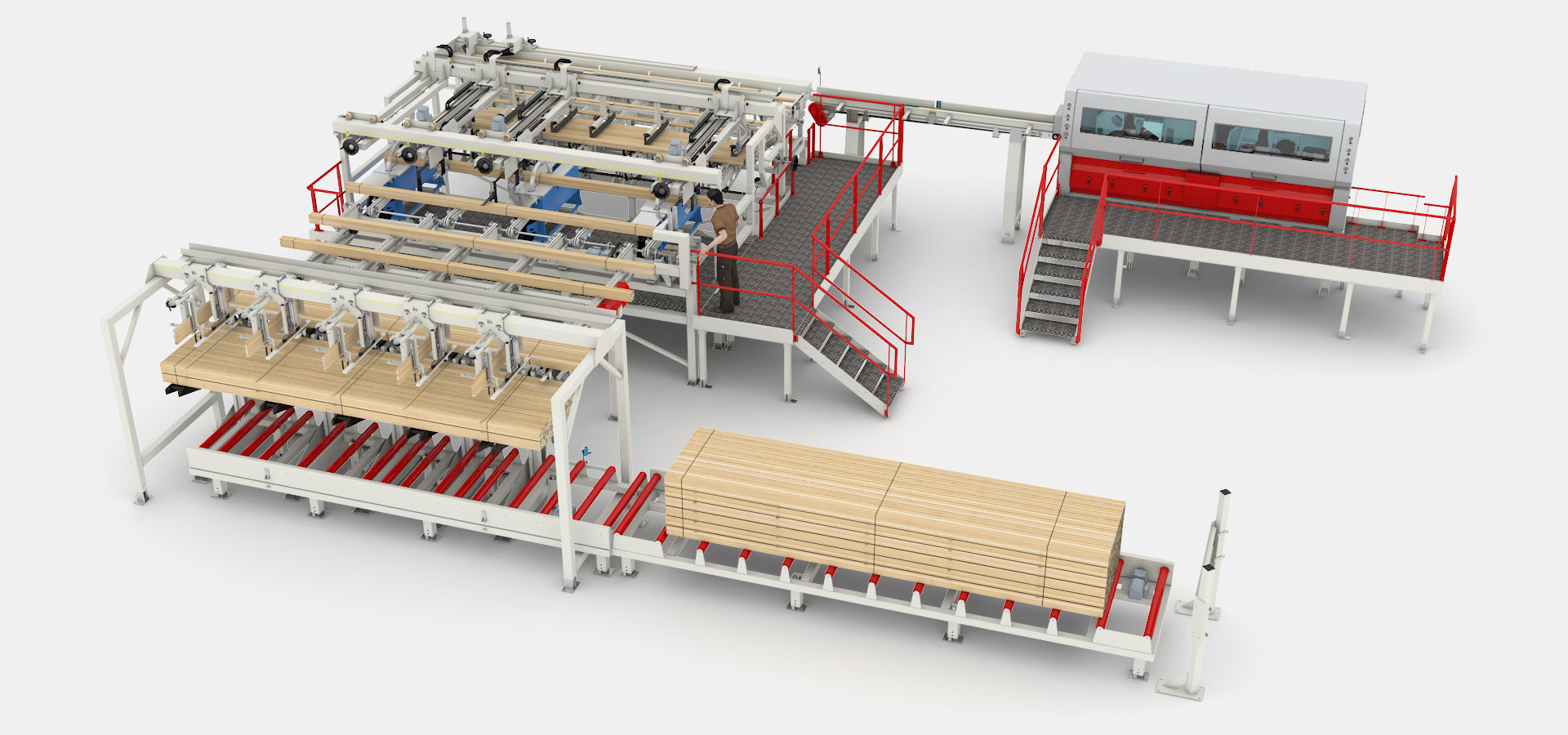 The completed and labelled bundles are then automatically transported to a stacking system stacking the bundles into packs, and stability sticks are placed between each layer.