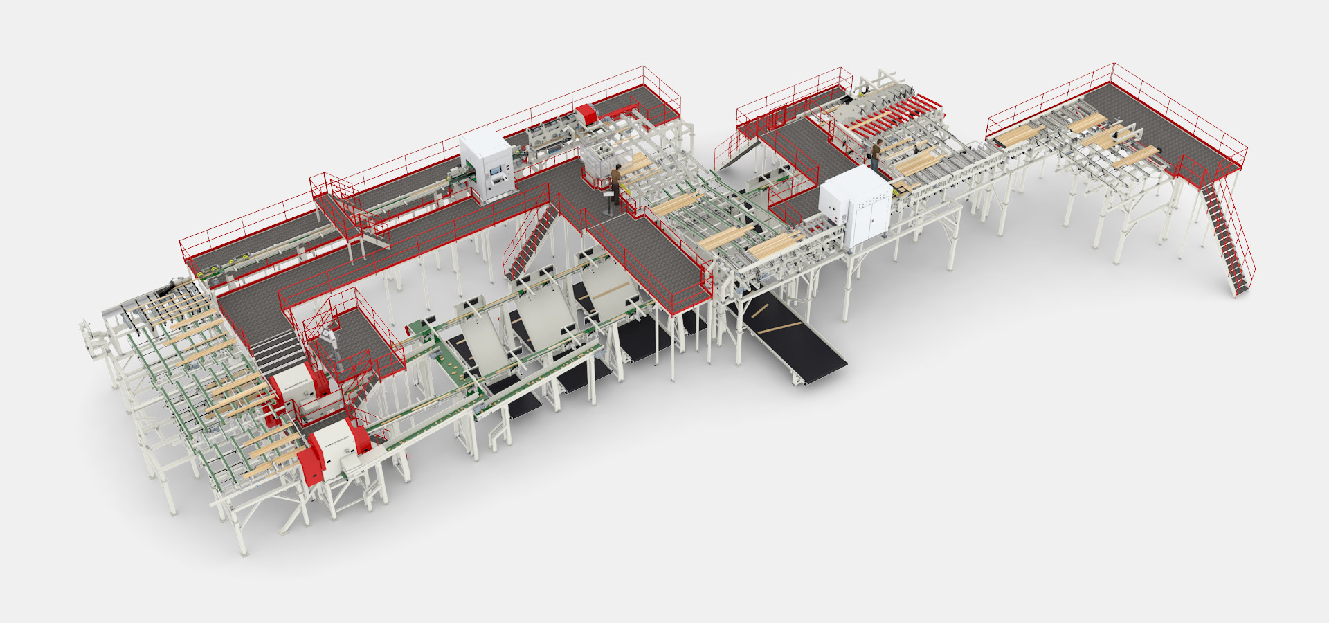 At first, workpieces are fed into the line by two feeding systems, in which each feeding system creates batches of workpieces. These are fed into a self-centering batch planer, and then transported to a scanning unit. A trim saw, placed in between the planer and scanner, trims workpieces with spear ends and/or curved workpieces. Then, a high-speed scanner feeder feeds workpieces into a scanner. After scanning takes place, workpieces enter a buffer system that distributes workpieces to two Opti-Kap 5003 saws. Finally, workpieces are managed by sorting belts which sort workpieces out and thus, prepare them for the subsequent processes.