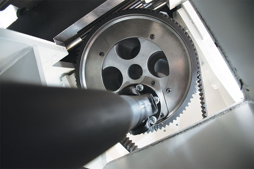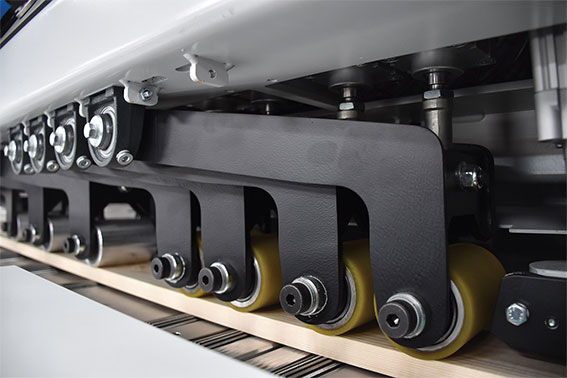 The forward motion of workpieces inside the saw is achieved as a result of 9 servo driven bottom rollers and 9 double pneumatically-activated pressure rollers. Both the driven and the pressure rollers are double-supported to ensure maximum contact with the workpieces and to guarantee excellent accuracy and an exceptional capacity.