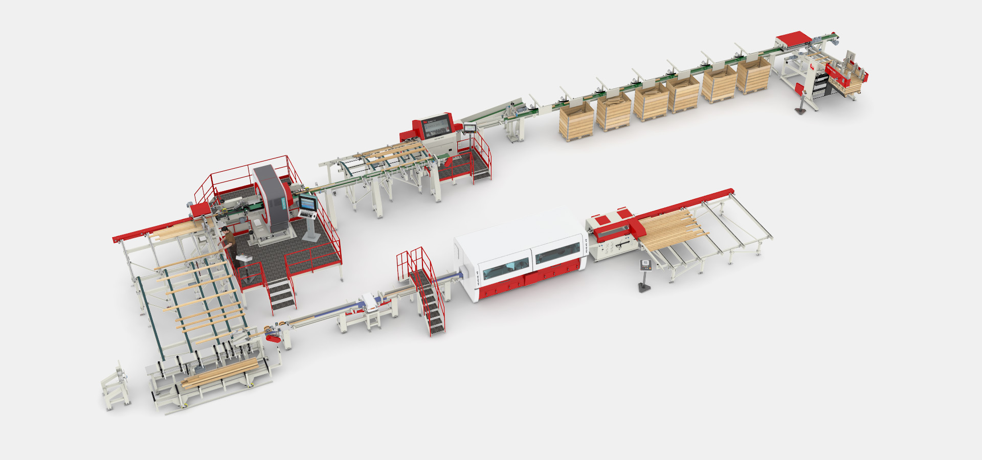 The initial stage of the Opti-Kap 5003 line is defined as the moulding of workpieces. Once workpieces have been processed by the moulder, they are measured by a moisture meter placed in line with the moulder. This device detects and sorts out workpieces with moisture contents above moisture content limits. Workpieces that adhere to moisture content limits are eventually carried onto a Microtec Goldeneye 301 scanner for the identification of hardwood abnormalities and defects. Next, the Opti-Kap 5003 saw optimizes and cuts workpieces into components by making the most effective use of raw wood. Finally, workpieces are carried out to sorting belt conveyors in which they are categorized according to wood qualities, finger-jointing and fixed lengths.