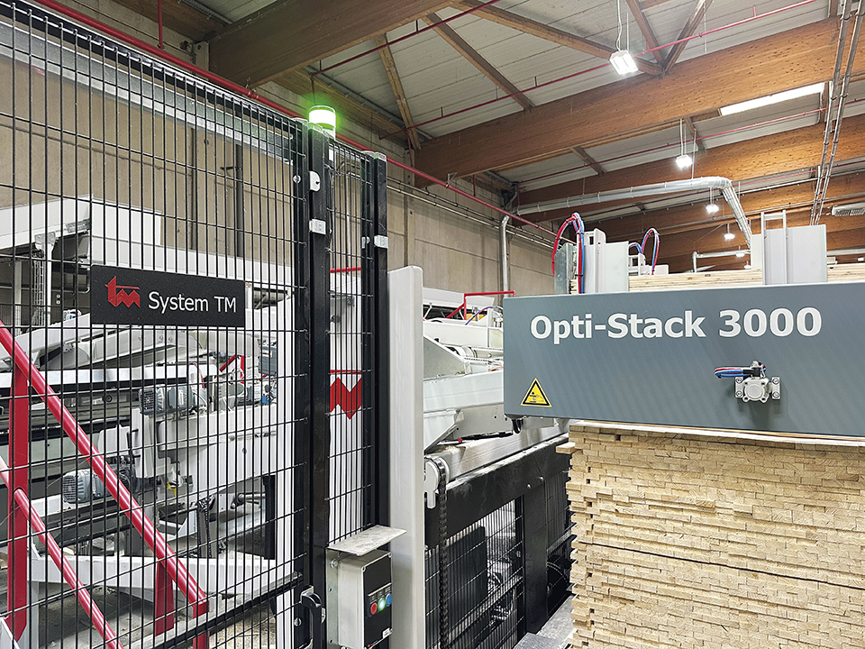 Here the parts are cut to the correct length and can be turned, if necessary, before being stacked for pickup by one of the line’s four Opti-Stack 3000 stackers. The finished workpieces are then used for the glulam board production.