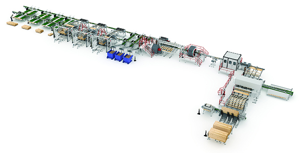 The moulder calibrates the workpieces on all four sides. Next, the workpieces move onto a MiCROTEC Goldeneye 502 scanner with X-ray, after which the workpieces are distributed among two optimizing Opti-Kap 5103 cross-cut saws. After cross-cutting has taken place, the workpieces are marked based on their classification of quality by a printer located after each saw. Then, the workpieces are sorted for finger-jointing and fixed lengths are stacked automatically by three Opti-Stack 3000 stacking machines. Finally, drying sticks are placed between the layers in preparation for further processing (thermo treatment) of the packs.