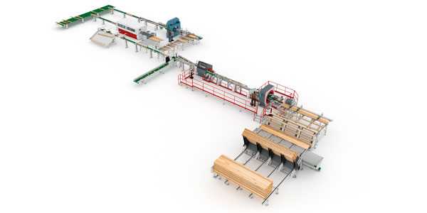 Initially, package feeding takes place by means of a tilt hoist. Then, a separator makes sure Radiata Pine workpieces are separated and organized before arriving at the subsequent conveyor. As workpieces move along the conveyor, they enter the MiCROTEC GE301 scanner. Then, scan results are transferred to an optimizing software program which calculates optimal cutting positions and instructs the Opti-Kap 5103 cross-cut saw how to cut workpieces with maximum wood utilization. Eventually, workpieces leave the cross cut line to be sorted to different locations for further processing, such as a moulder and/or a band re-saw.