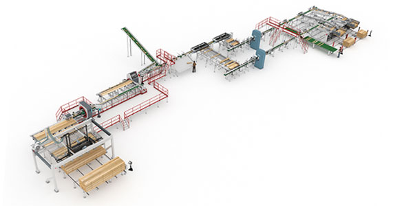 The first stage in the optimizing Opti-Kap 3003 cross-cut line is represented by package feeding. Freshly cut wood is transported by chain conveyors into an automated vacuum feeding machine, Opti-Feed 6000 Vack, which arranges workpieces on conveyor chains before they enter a MiCROTEC GE301 scanner. Then, scan results are passed on to an optimizing software program that calculates optimal cutting positions and instructs the Opti-Kap 3003 cross-cut saw to cut workpieces with maximum wood utilization. An air sweeper sweeps short lengths. Two automatic sweepers transport workpieces onto two band re-saws for splitting. Finally, workpieces are stacked using an automated stacker, Opti-Stack 3000.