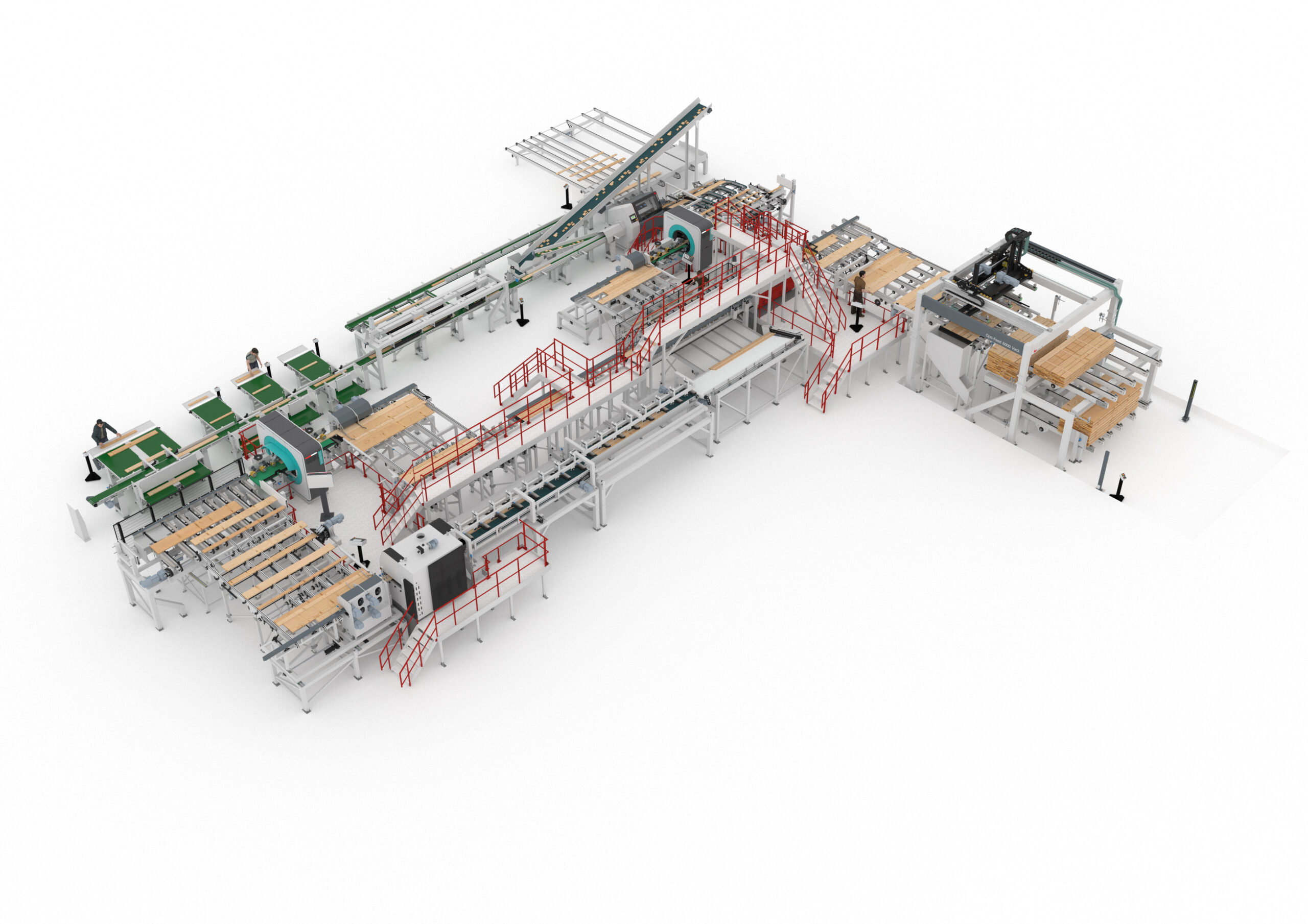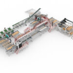 Optimized to fit in a compact space, the cross-cut line starts with an Opti-Feed 6000 Vack that destacks bundles to a planer infeed. There is an additional pack infeed conveyor above the lower conveyor that enables a pack to exit the line in the event of a production change. This allows for seamless material changes without having to remove the next bundle waiting to be destacked.