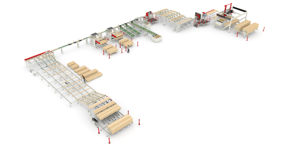 The solution from System TM consist of an automated stacking system model Opti-Feed 6000 Vack. The layers from the incoming packs are automatically fed to the Microtec scanner model Goldeneye 301, that detects defects and quality of the wood before the cross-cut saw. This scanner is without x-ray, but it will be possible to upgrade to x-ray in the future. After the scanner the workpieces are, via a stud carrier, transported through the optimizing cross-cut saw model Opti-Kap 3003 where the workpieces are cut according to the scanning results. The line has been prepared for a second cross-cut saw in the future.